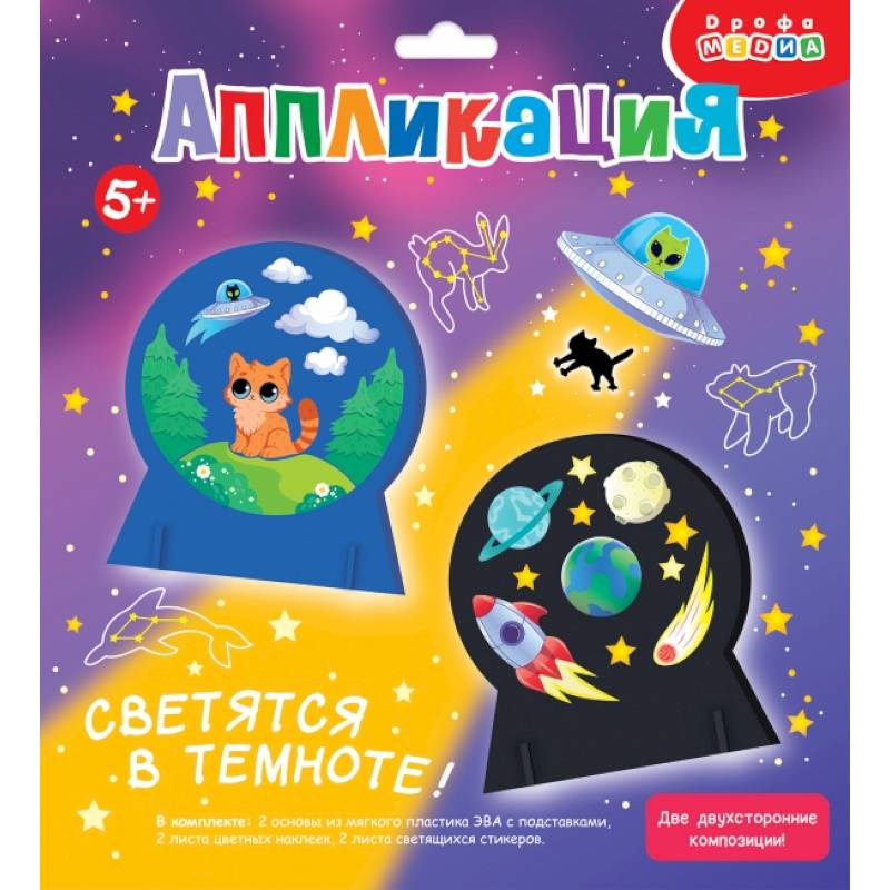 В комплекте: 2 основы из мягкого пластика ЭВА с подставками, цветные наклейки, светящиеся стикеры.