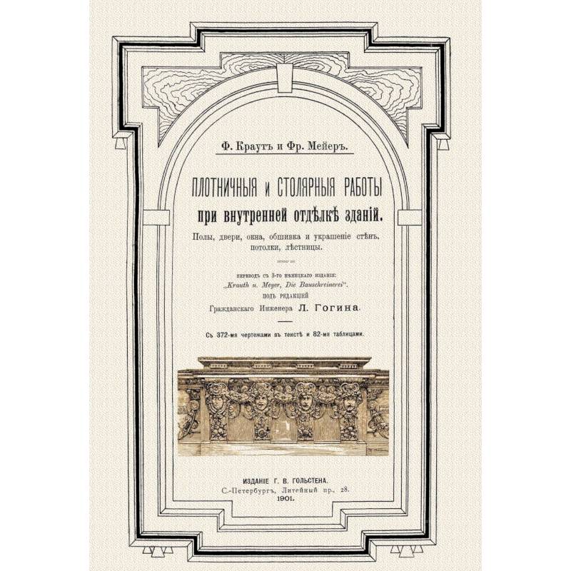1) Плотничные и столярные работы при внутренней отделке зданий. Подробное столярное руководство для производства деревянных архитектурных деталей с большим количеством чертежей и подробным технологическим описанием. Настольная книга столяра и архитектора. Интерьерный Дизайн. Деревянные Детали Интерьера. Деревянное зодчество. Архитектура. Перевод с 3-го немецкого издания гражданского инженера Л. Гогина. С 372-мя чертежами в тексте и 82-мя таблицами. С.-Петербург. Издание Г. В. Гольстена. 1901 г.